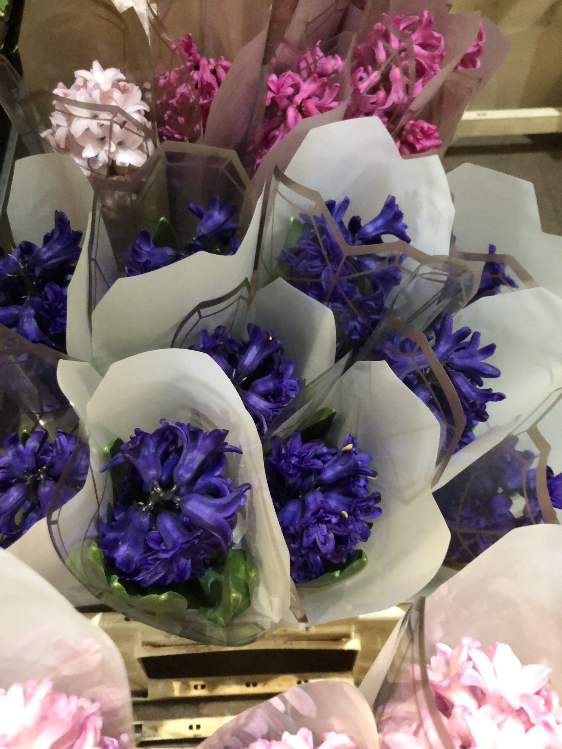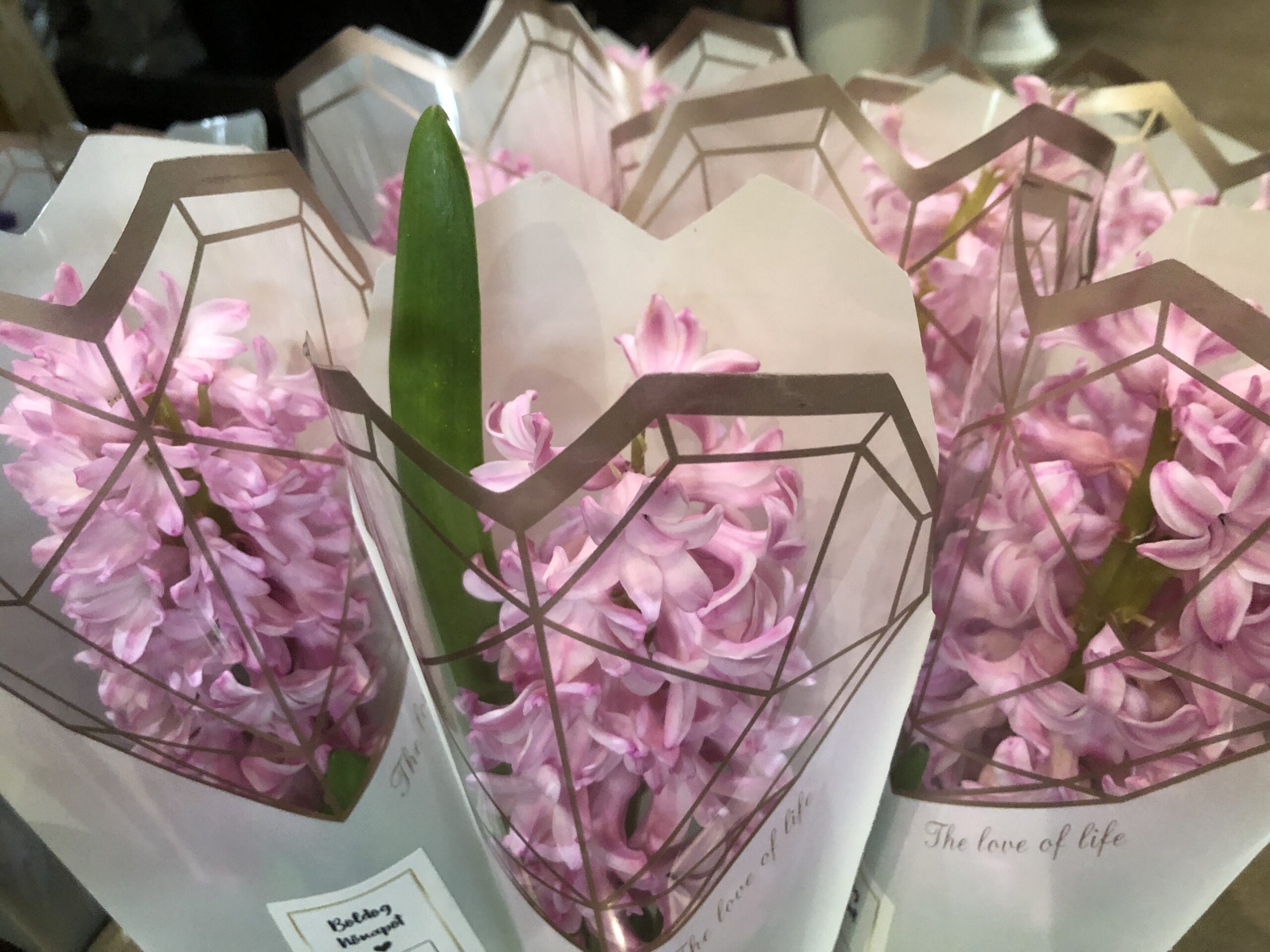 Egy szálas Jácint különböző színekben, dísztasakban.