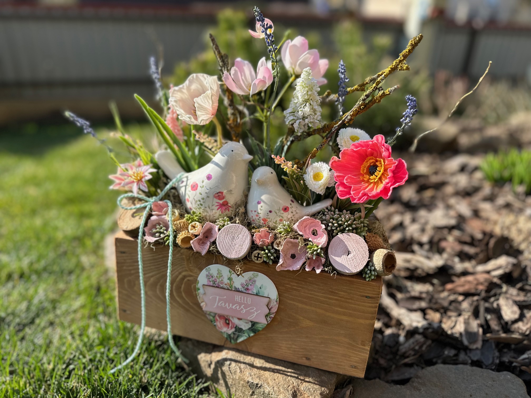 Ez a bájos, természet ihlette dekoráció igazi tavaszi hangulatot varázsol otthonodba. A rusztikus fa ládában elhelyezett virágkompozíciót két kedves madárfigura és aprólékosan kidolgozott díszítőelemek teszik különlegessé. A „Hello Tavasz” feliratú szív dekoráció még vidámabb, friss hangulatot kölcsönöz a kompozíciónak.