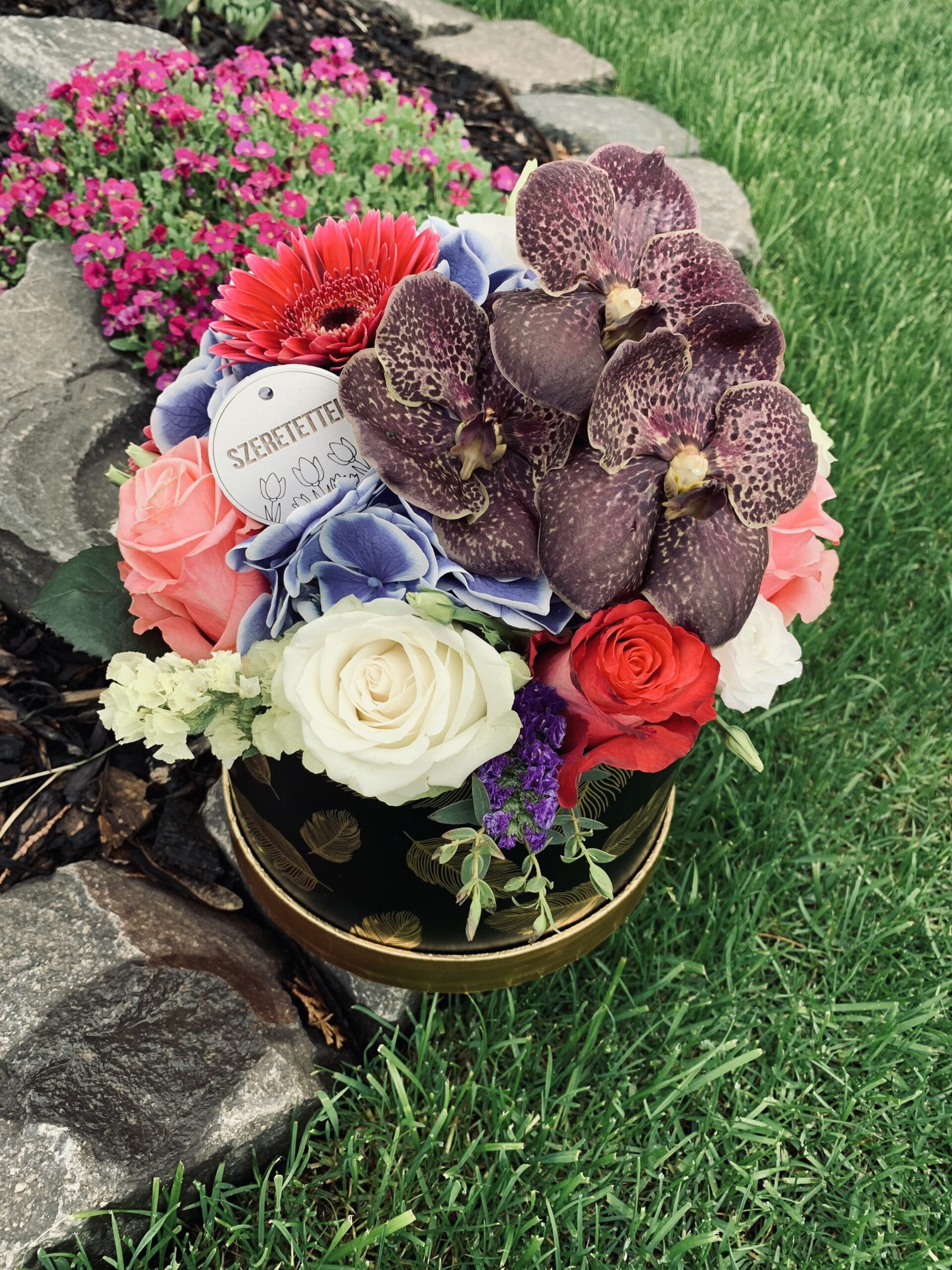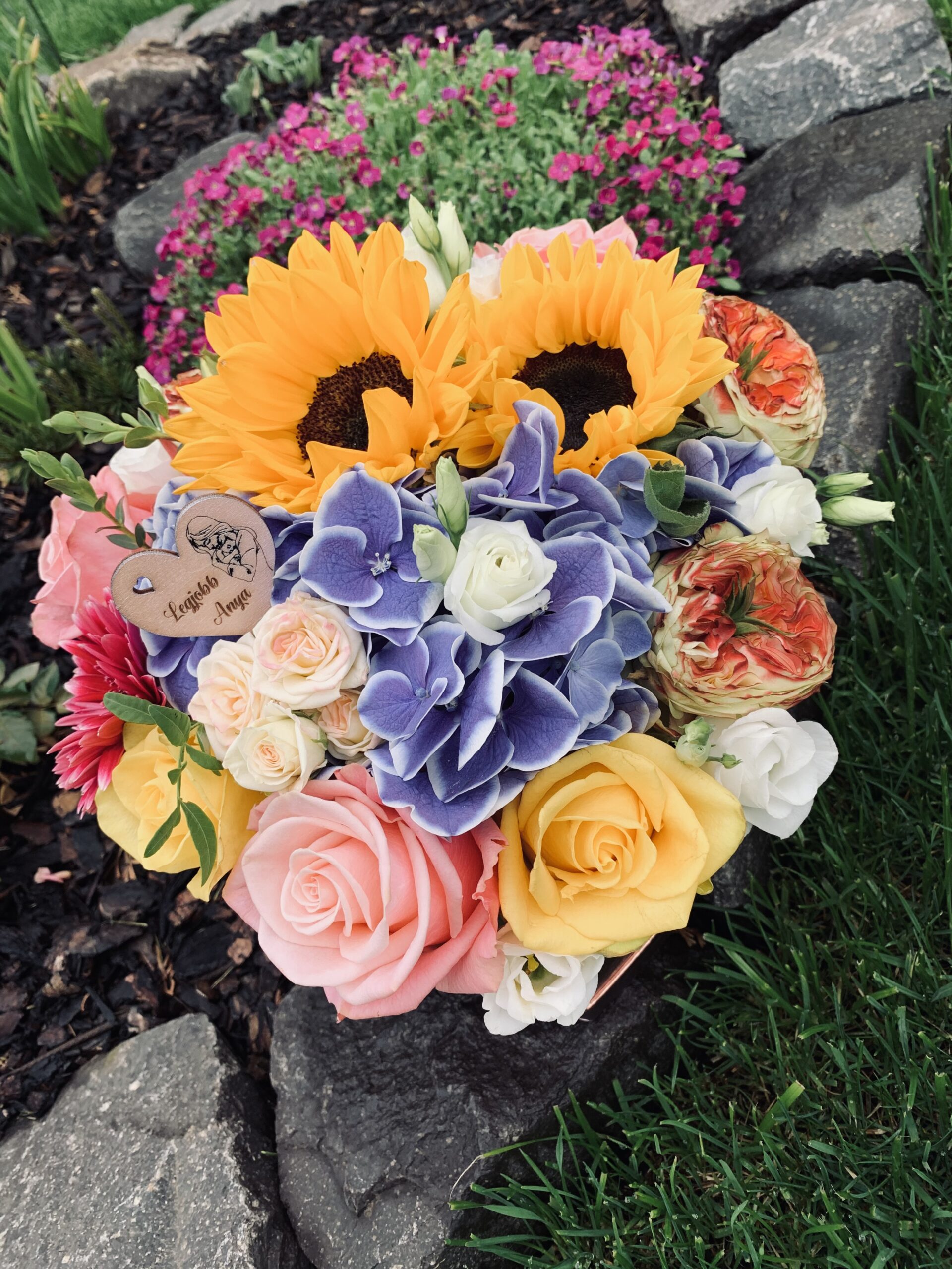 Elegáns színes árnyalatú virágkompozíció. Különböző méretű és színű virágdobozban – szívhez szóló meglepetés amely örömet okoz minden édesanyának.