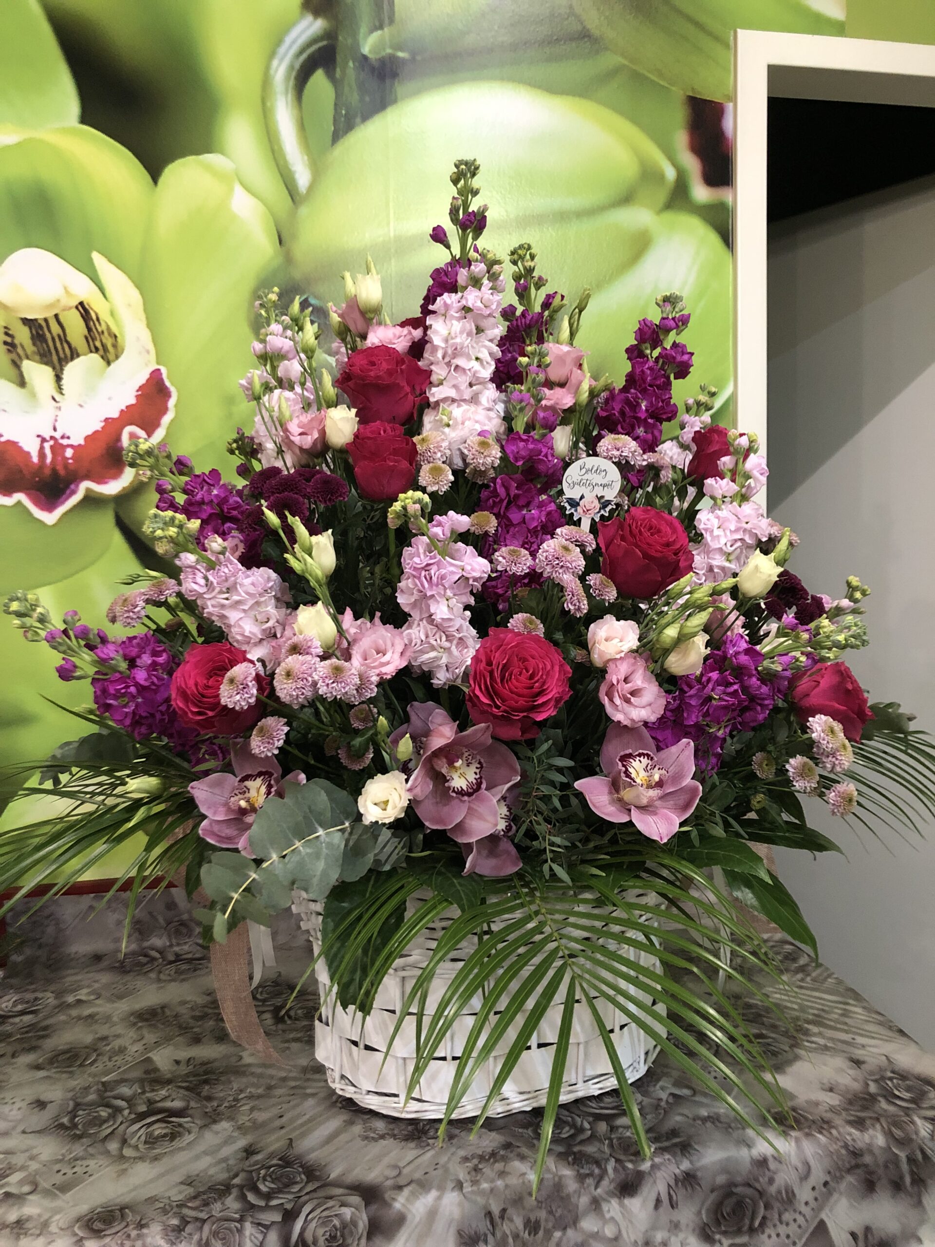 Elegáns rózsaszín és pink színekből összeállított virágkosár ( viola-rózsa-lisiantus-santini-orhidea-díszítő zöldek)